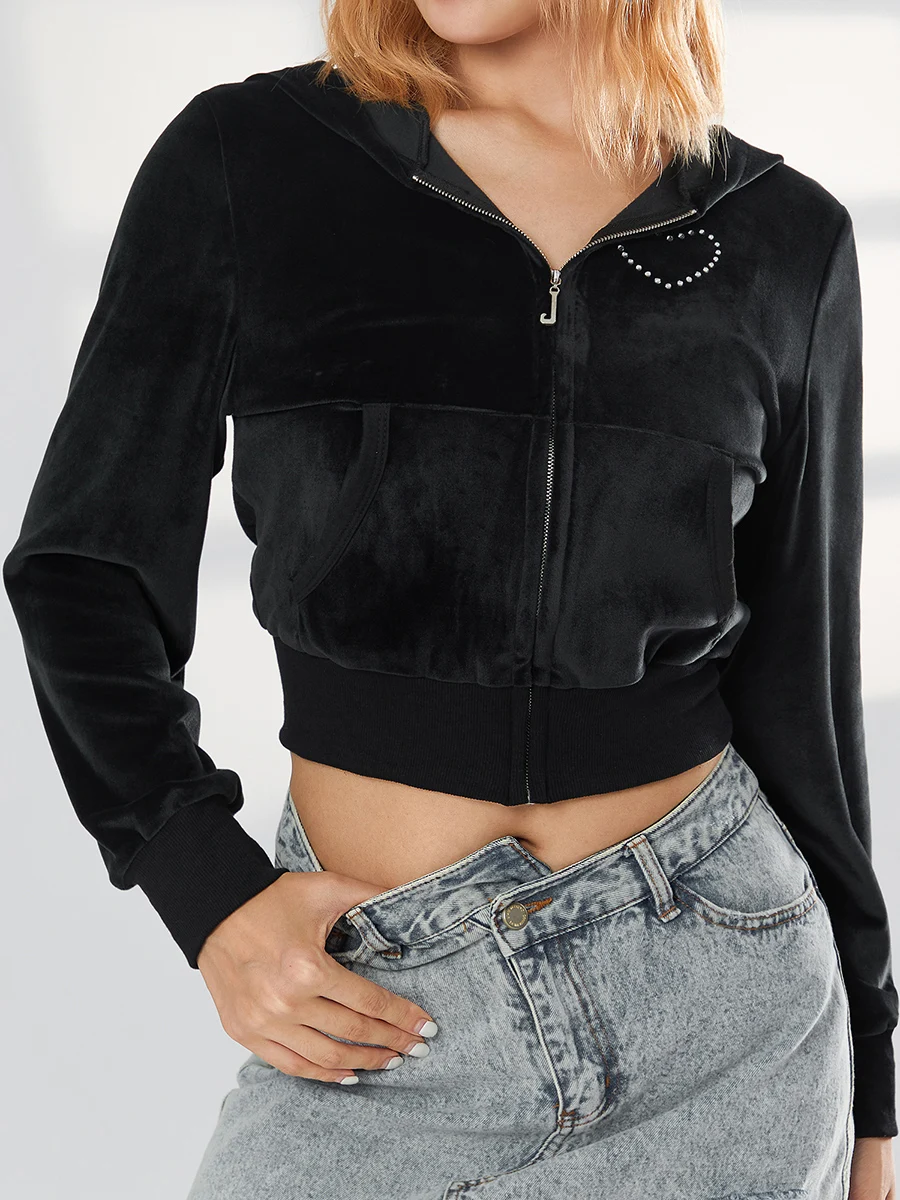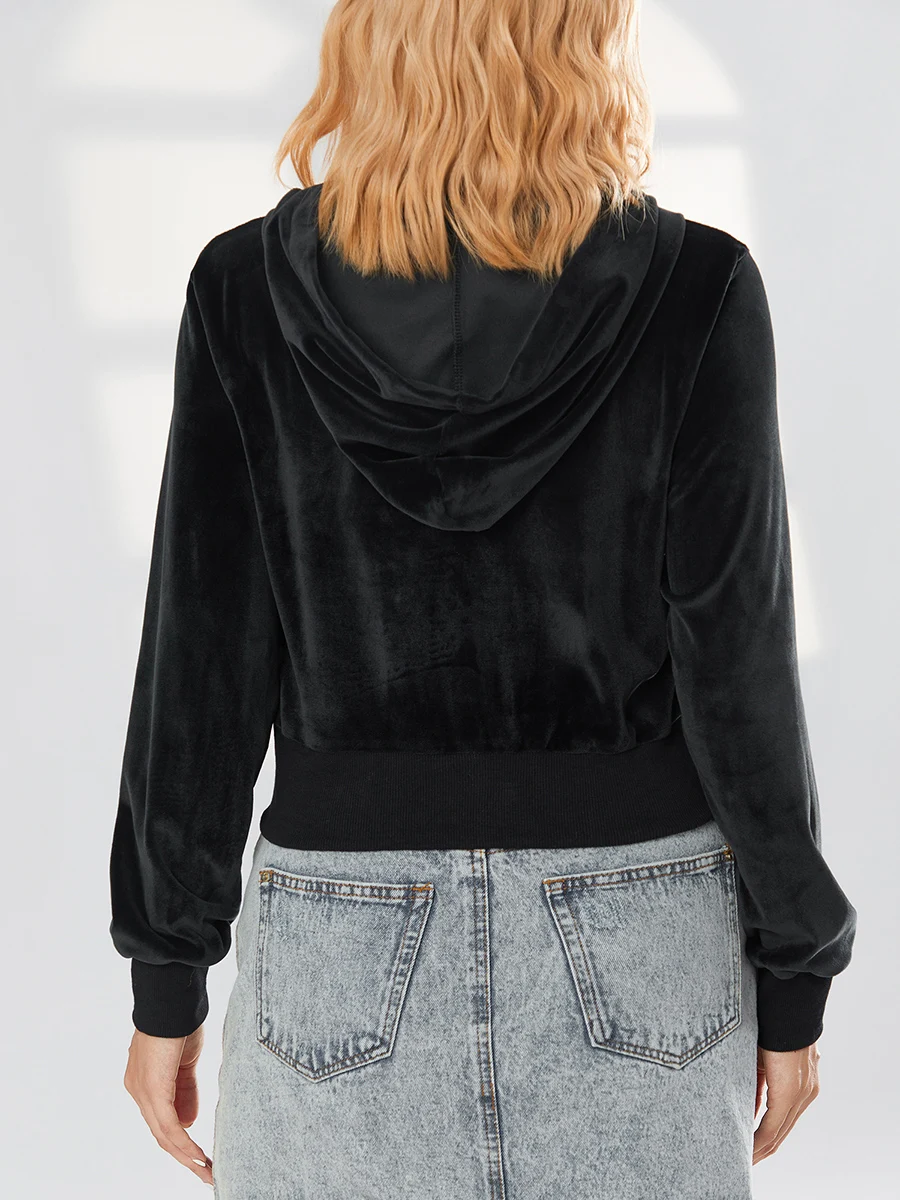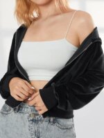 Ce gilet à capuche court en velours stretch avec poches pour femme est conçu avec des matières de qualité comme ce velours au fini brillant si tendance. Le design bien étudié propose un gilet très court muni de petites poches joliment ourlées de tissu mat, d'une grande capuche stylée sans cordon et d'une large bande élastique en bas et au bas des manches.