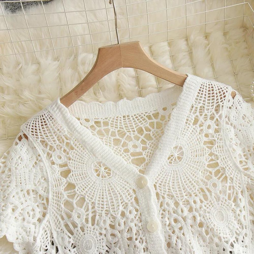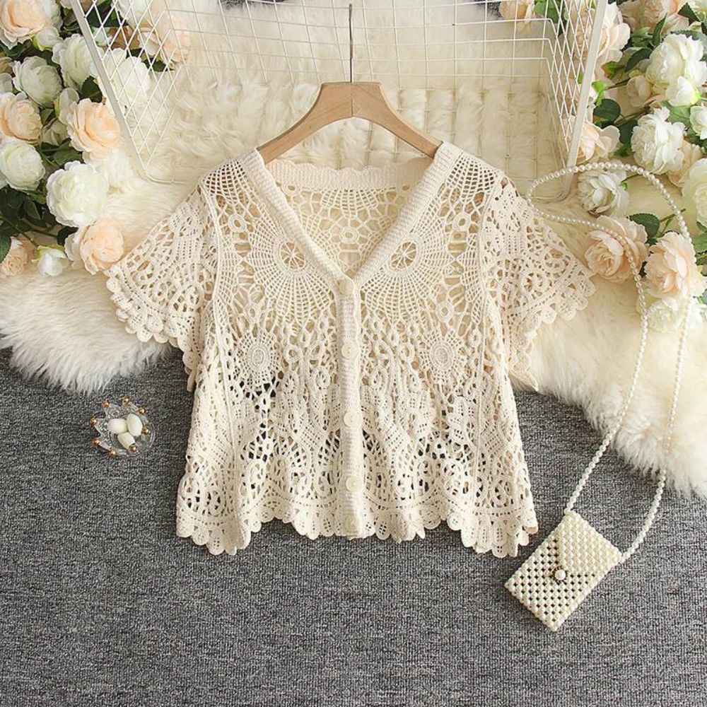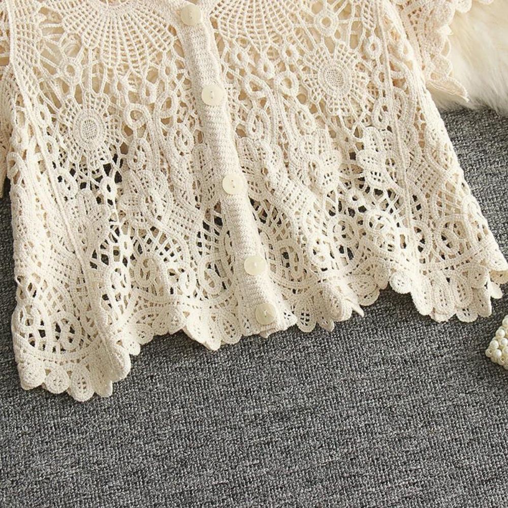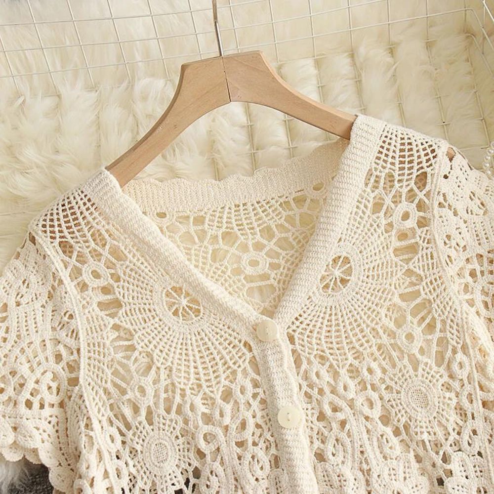 Embrassez un style bohème et féminin avec ce gilet en crochet. Sa coupe courte et aérée est parfaite pour superposer sur une longue robe fluide avec des sandales, créant une allure romantique et éthérée.