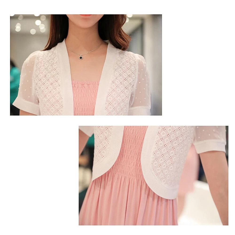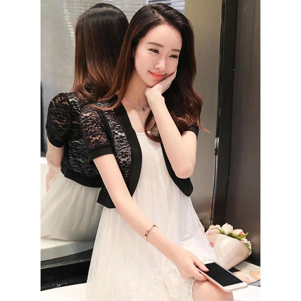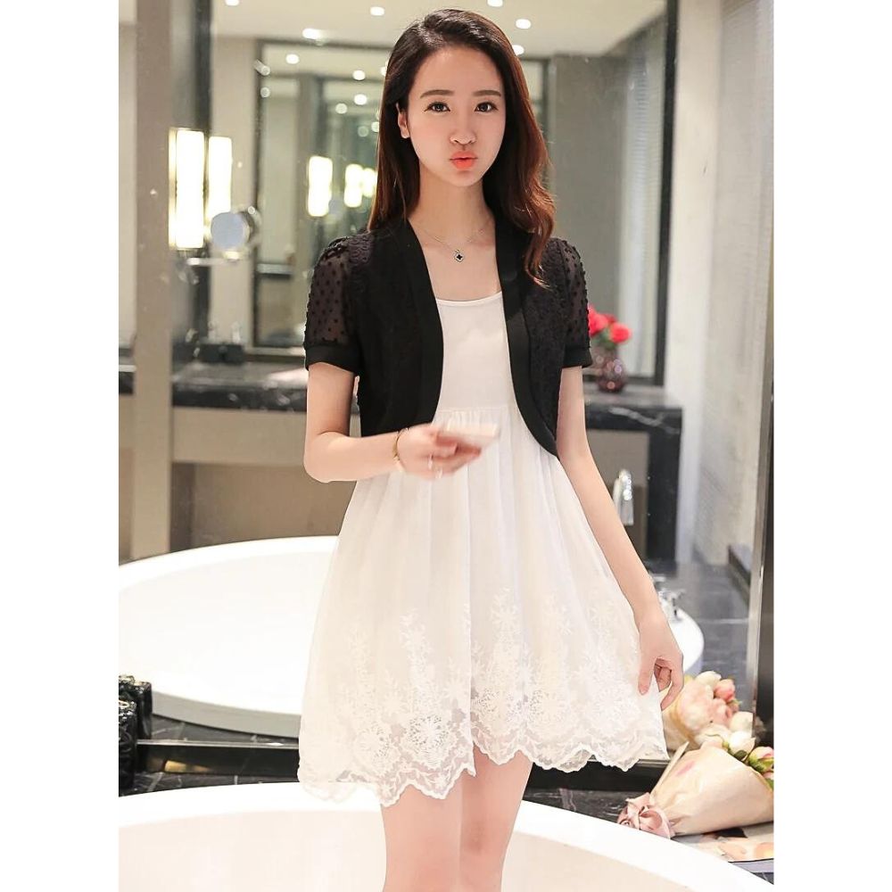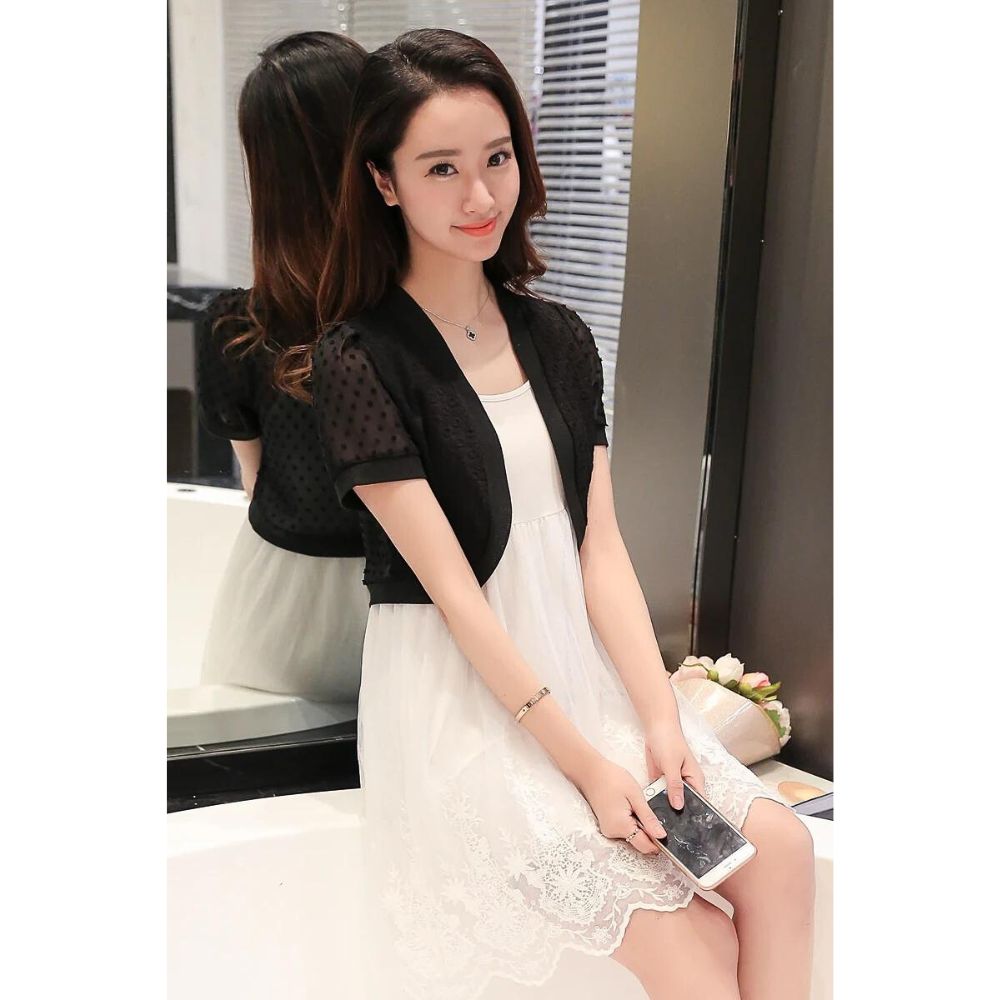 Notre gilet court élégant noir ou blanc à effet dentelle pour femme, ajoute une touche sophistiquée à votre tenue. Disponible en noir ou en blanc, il apporte du raffinement à votre look. Son design féminin en fait un choix parfait pour les occasions spéciales ou pour une soirée chic.