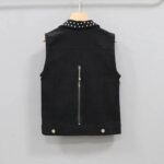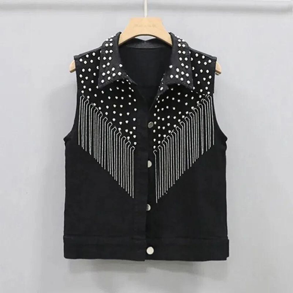 Notre gilet noir est doté de finitions soignées qui le distinguent des autres. Les clous ronds sur le haut du gilet ajoutent une touche de rock 'n' roll, tandis que les franges en métal apportent un élément unique et luxueux.