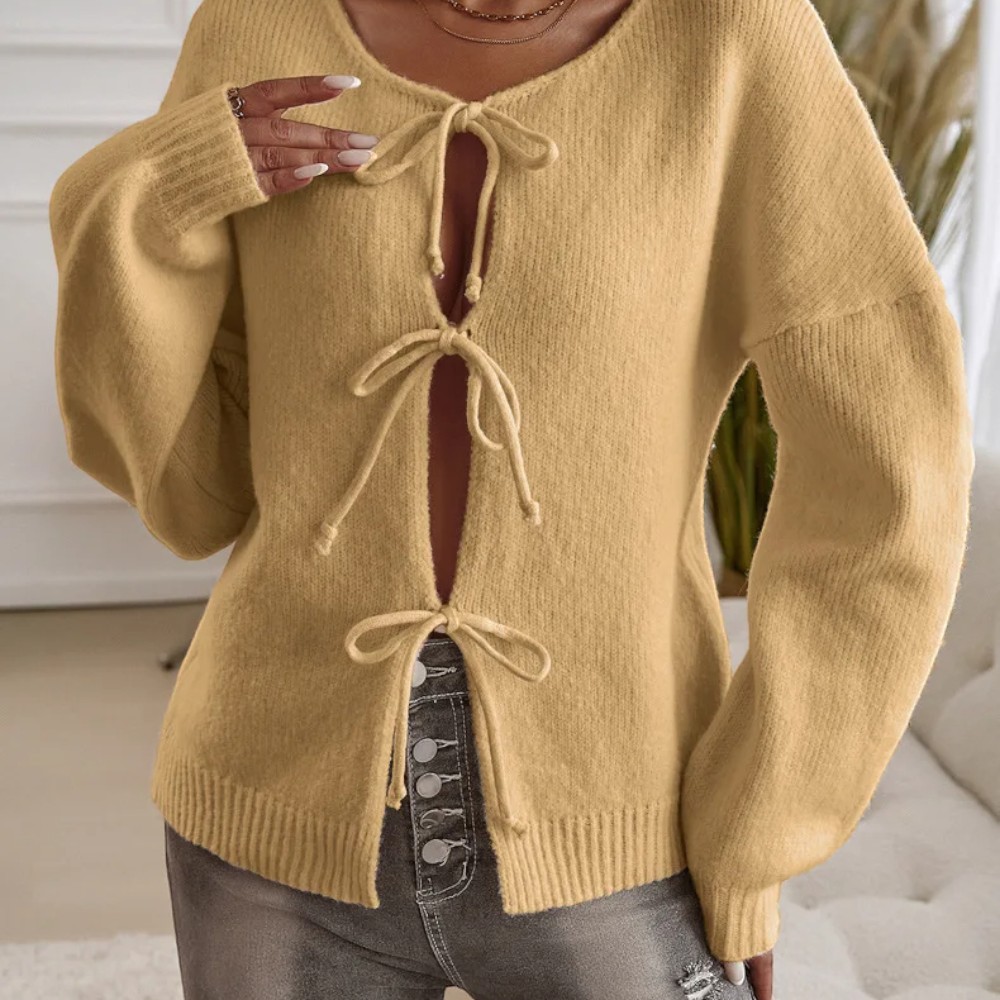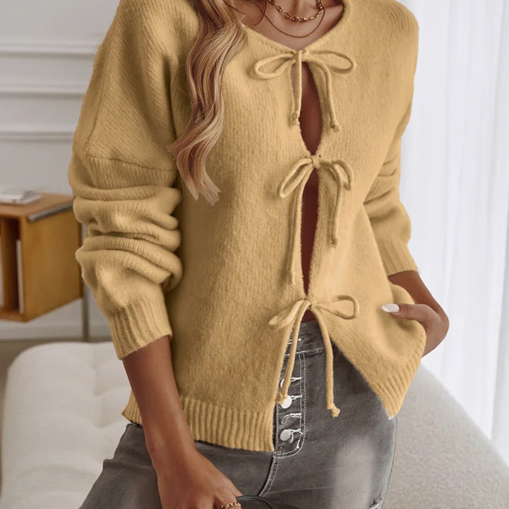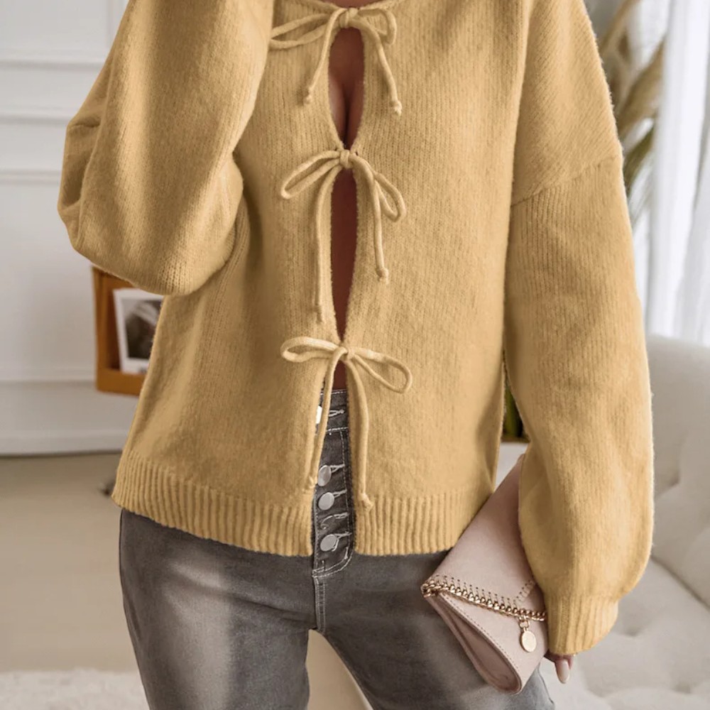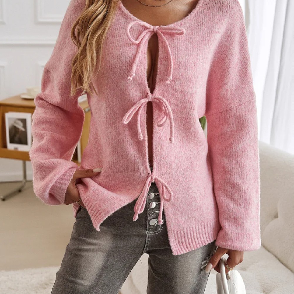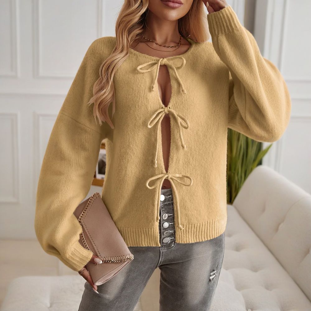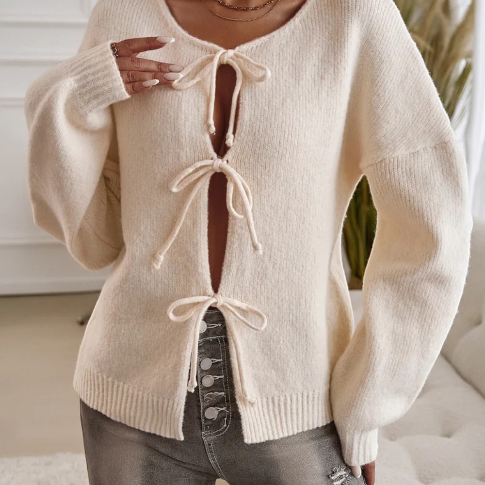 Laissez-vous séduire par ses finitions soignées : bordures côtelées, nœuds oversize et manches légèrement froncées : le combo parfait pour vous offrir une allure romantique, mais affirmée.