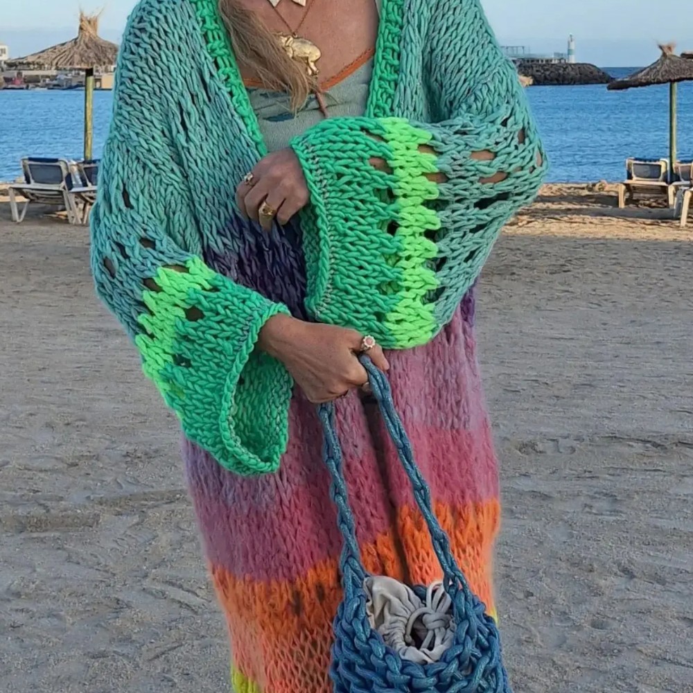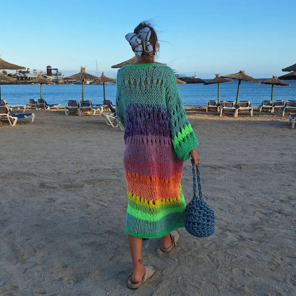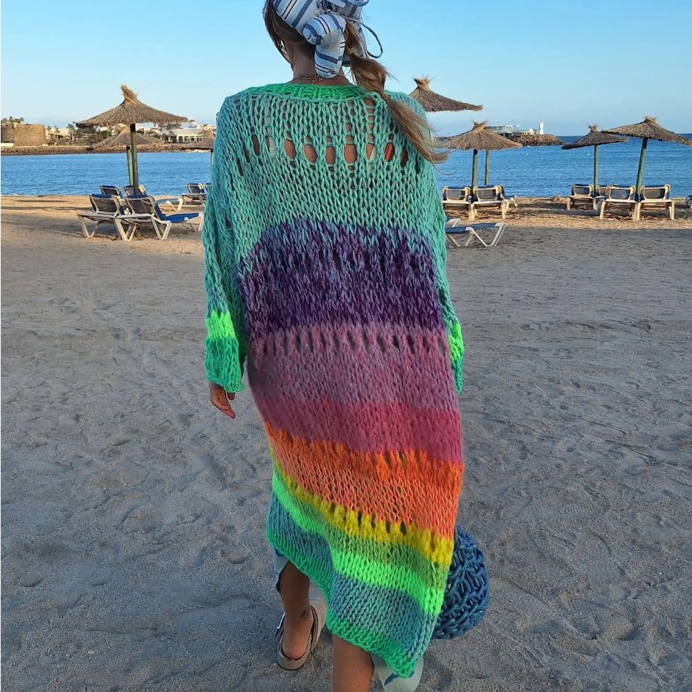 Gilet long oversize arc-en-ciel tricoté main