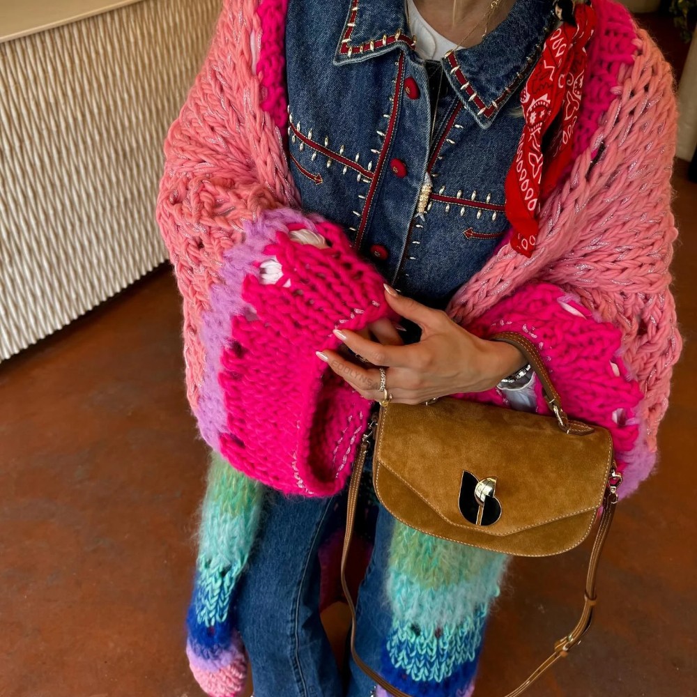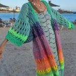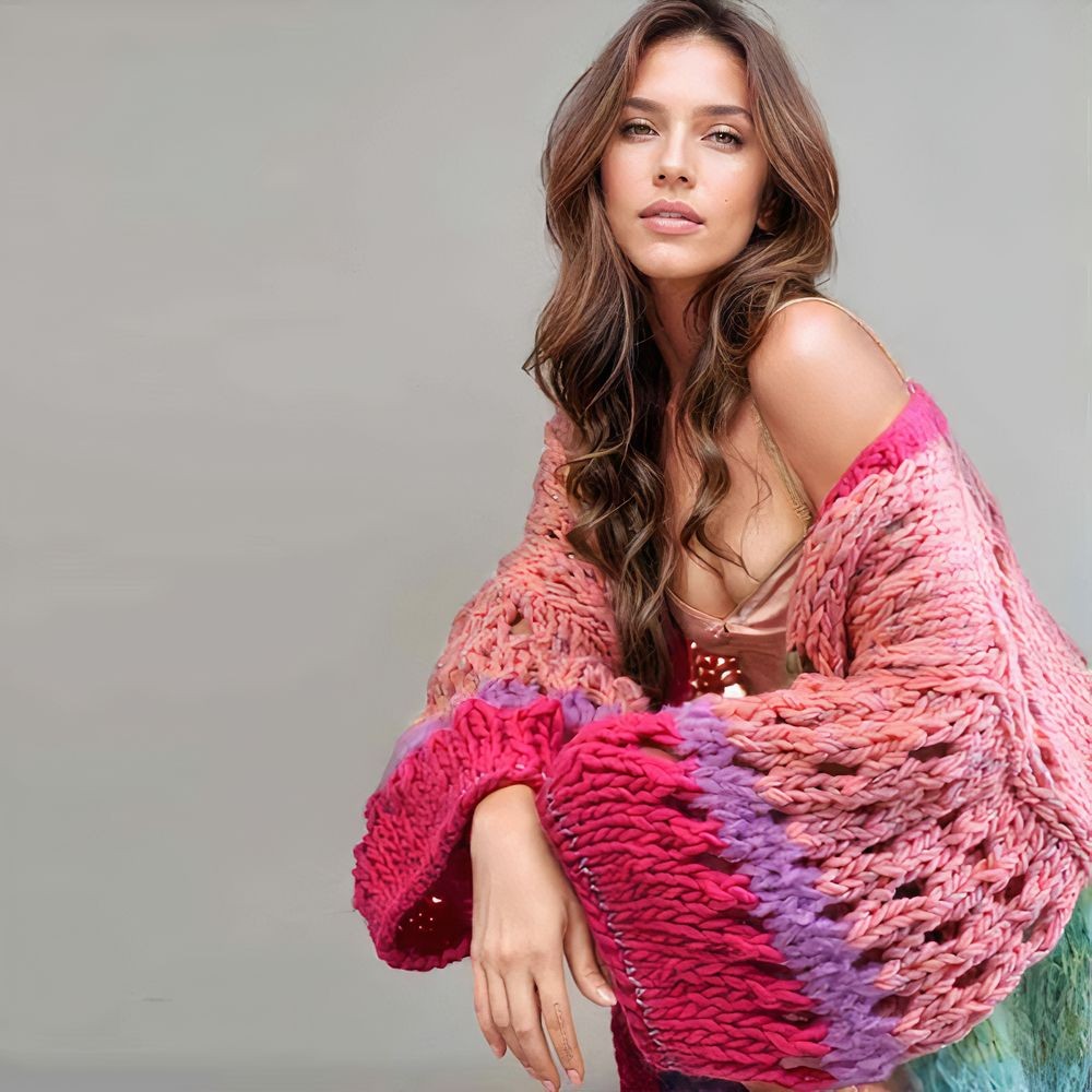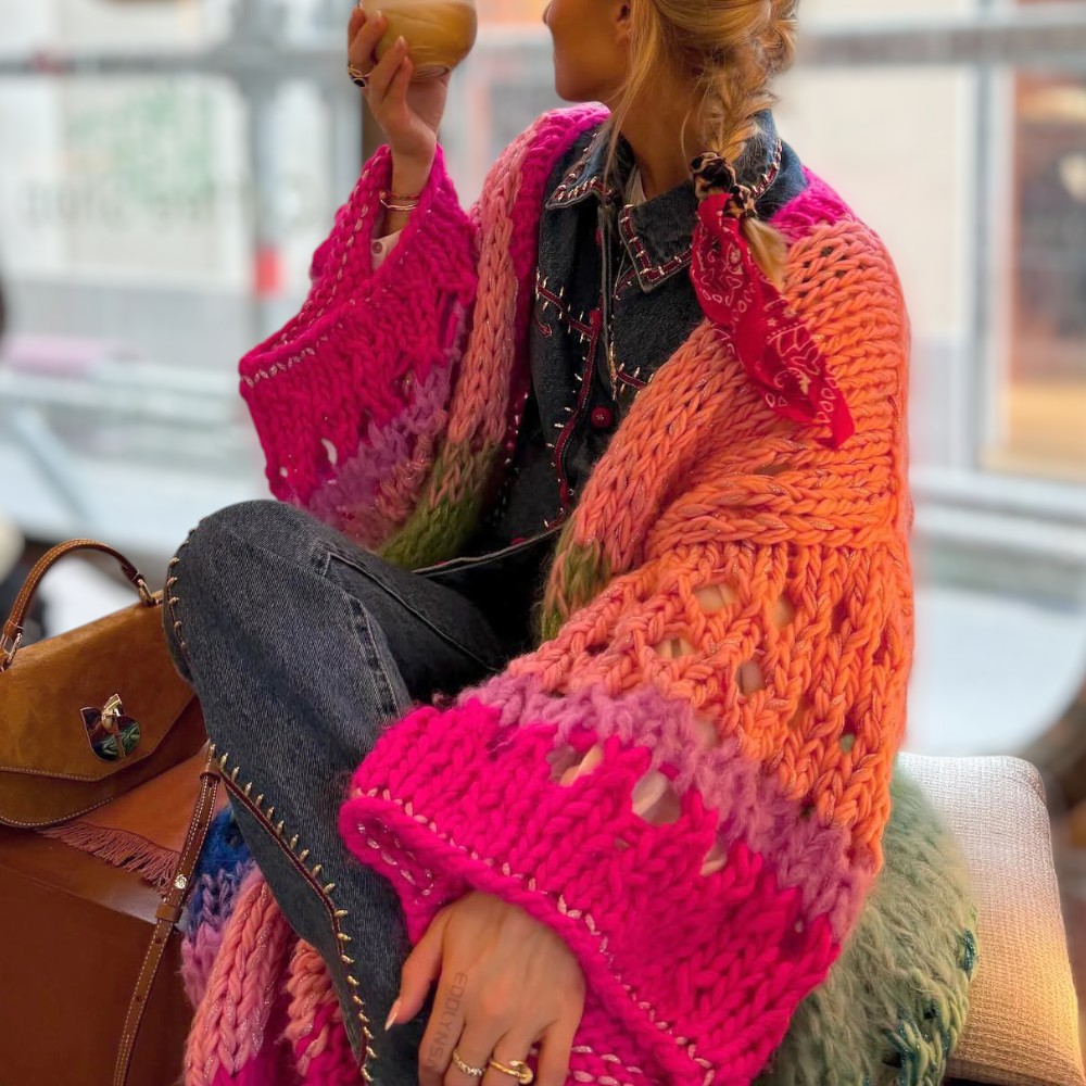 Vous voyez ce moment où l’on enfile une pièce et tout devient plus doux ? Ce gilet long oversize arc-en-ciel tricoté main vous enveloppe comme une caresse joyeuse. Il est coloré, vibrant, réconfortant.