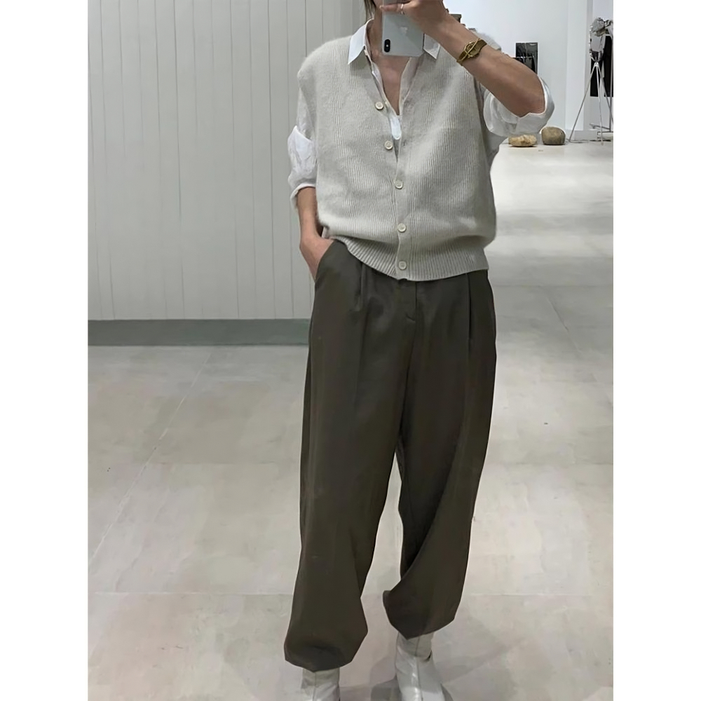 Les finitions soignées de ce gilet, notamment ses boutons délicats sur le devant, ajoutent une touche de sophistication à cette pièce autrement simple, rendant chaque modèle à la fois pratique et élégant pour une variété d'occasions.