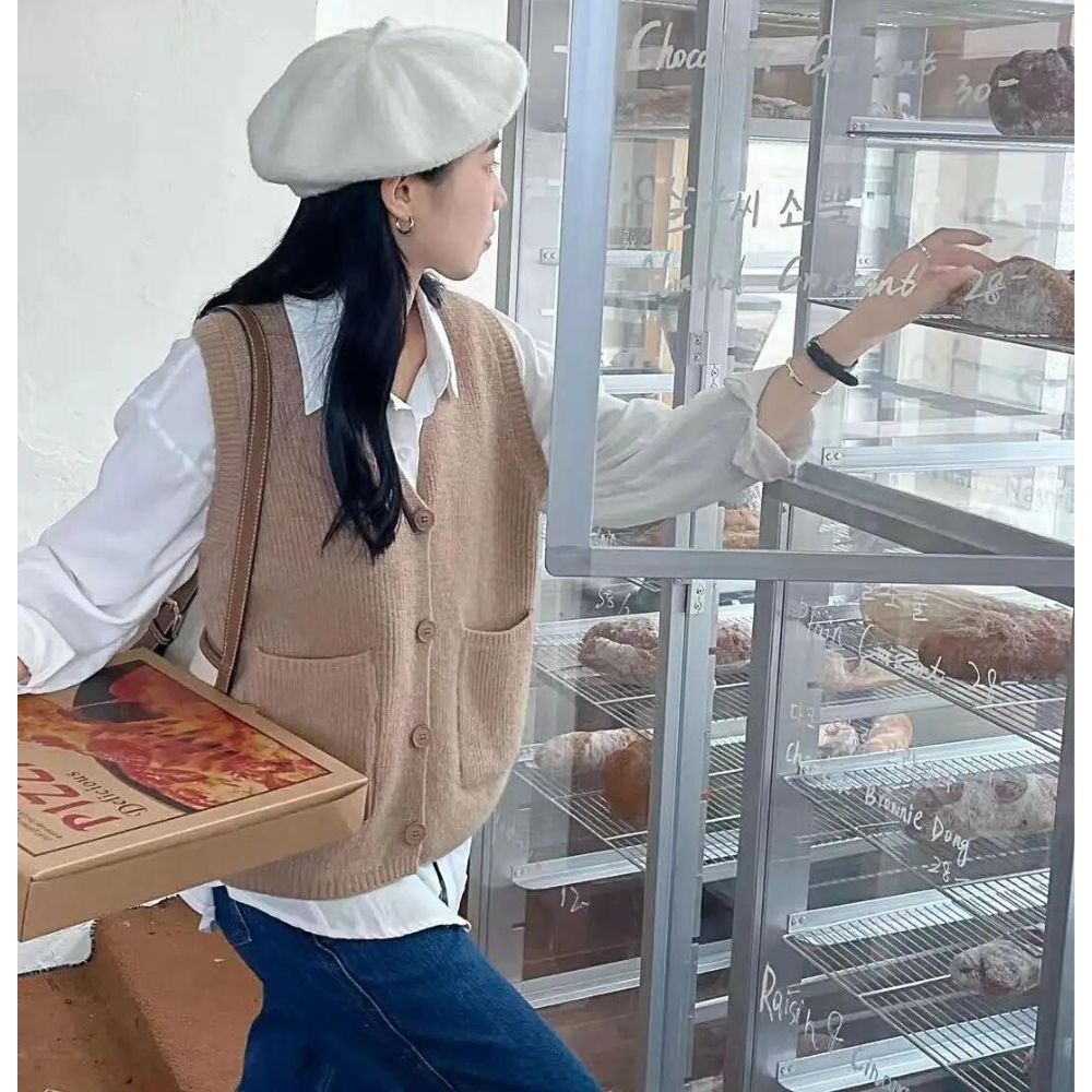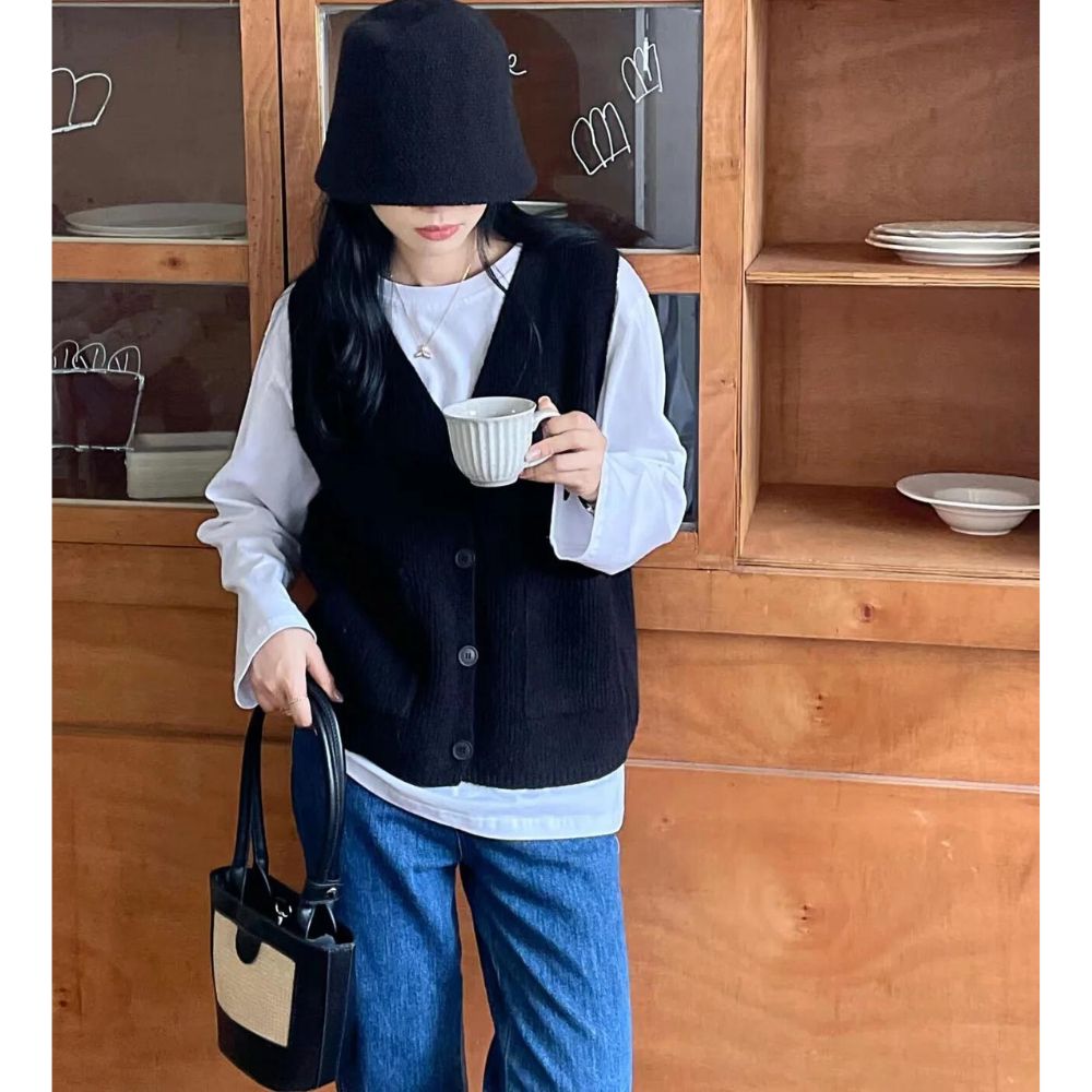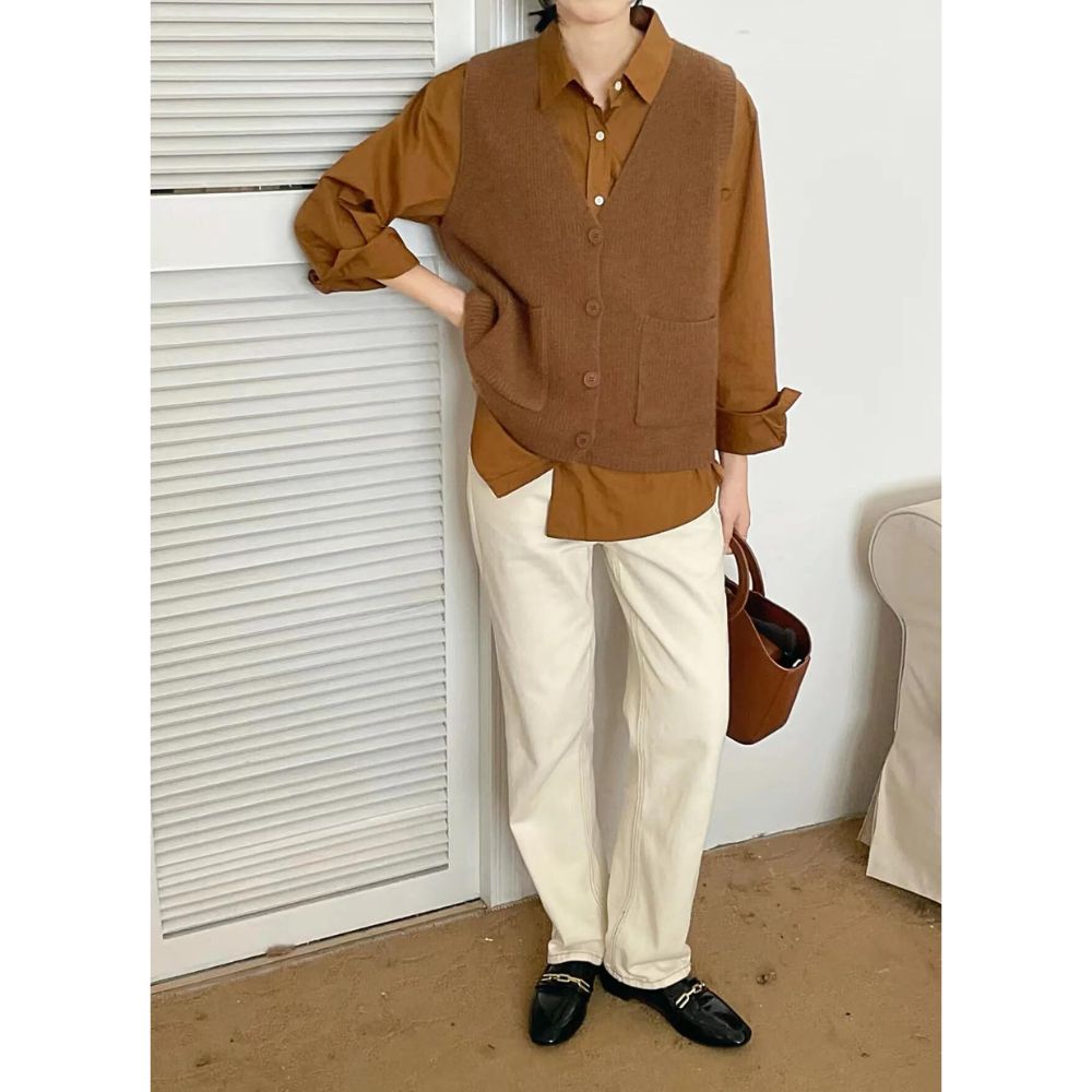 Notre gilet vintage sans manches n'est pas seulement élégant ; il est également conçu pour être extrêmement pratique. Équipé de deux grandes poches à l'avant, il offre suffisamment d'espace pour vos essentiels du quotidien, tandis que les boutons assortis à la couleur du gilet ajoutent un charme discret mais distinctif.
