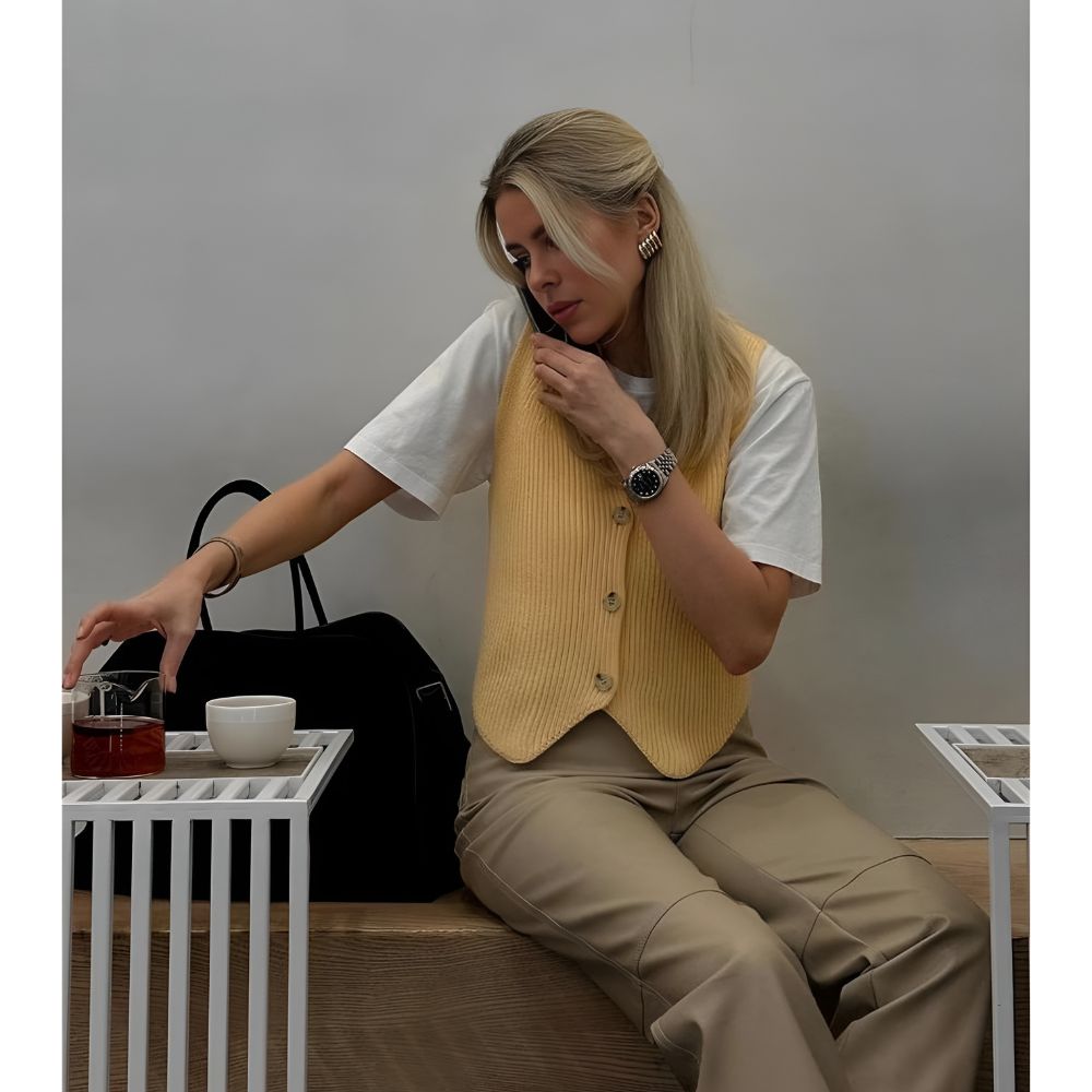 Le gilet peut être facilement associé à des pantalons de tailleur, des jupes ou des jeans, offrant une polyvalence et une élégance qui captivent. C'est l'investissement parfait pour toute femme désireuse de combiner fonctionnalité et mode dans sa garde-robe.