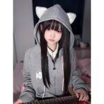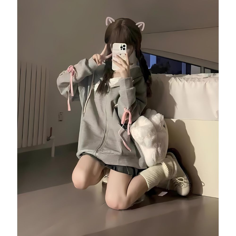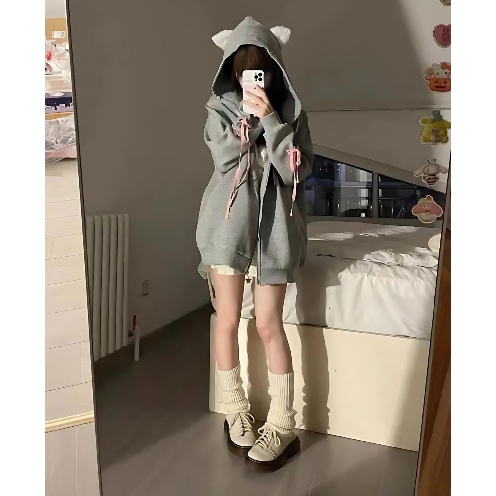 Embrassez un style adorable avec notre gilet kawaii, parfait pour les amatrices de la culture japonaise et de tout ce qui est mignon. Ce gilet, de couleur gris clair, est agrémenté d'oreilles de chat douces sur la capuche, ajoutant une touche charmante à votre tenue.