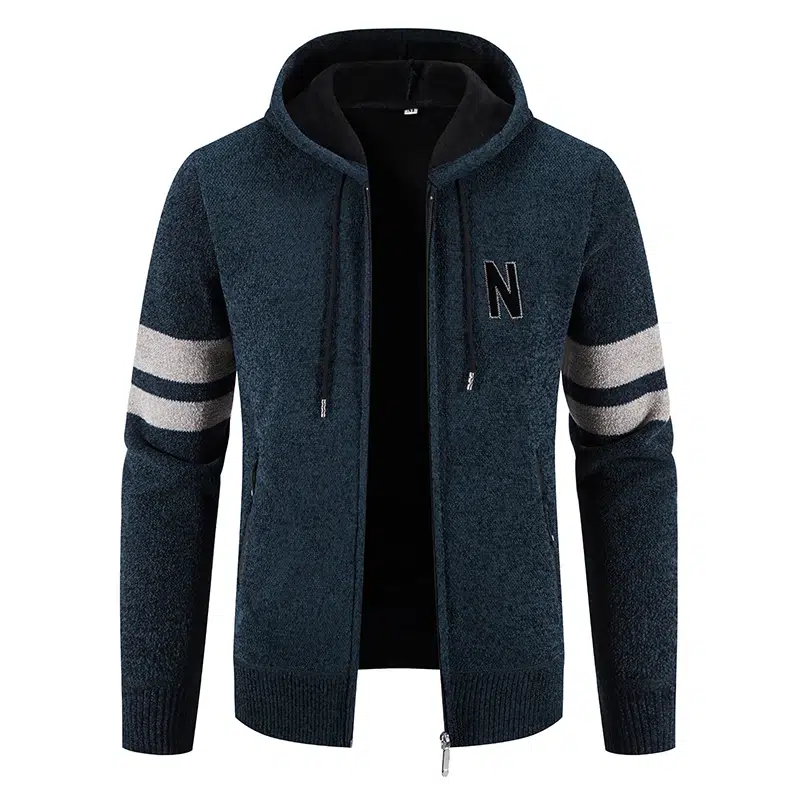 Ce gilet à capuche zippé en tricot pour homme a un style chaleureux de pull avec en plus le coté pratique du gilet à ouvrir ou fermer suivant le temps. Les bandes rayées de couleur différente sur les manches rappellent les équipements de sport et renforcent le style confortable du gilet ainsi que le logo sur le devant assez sobre et intemporel.