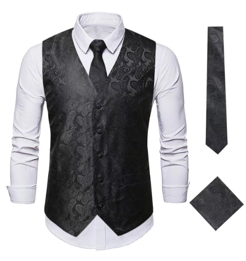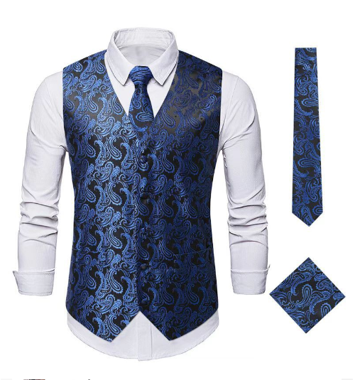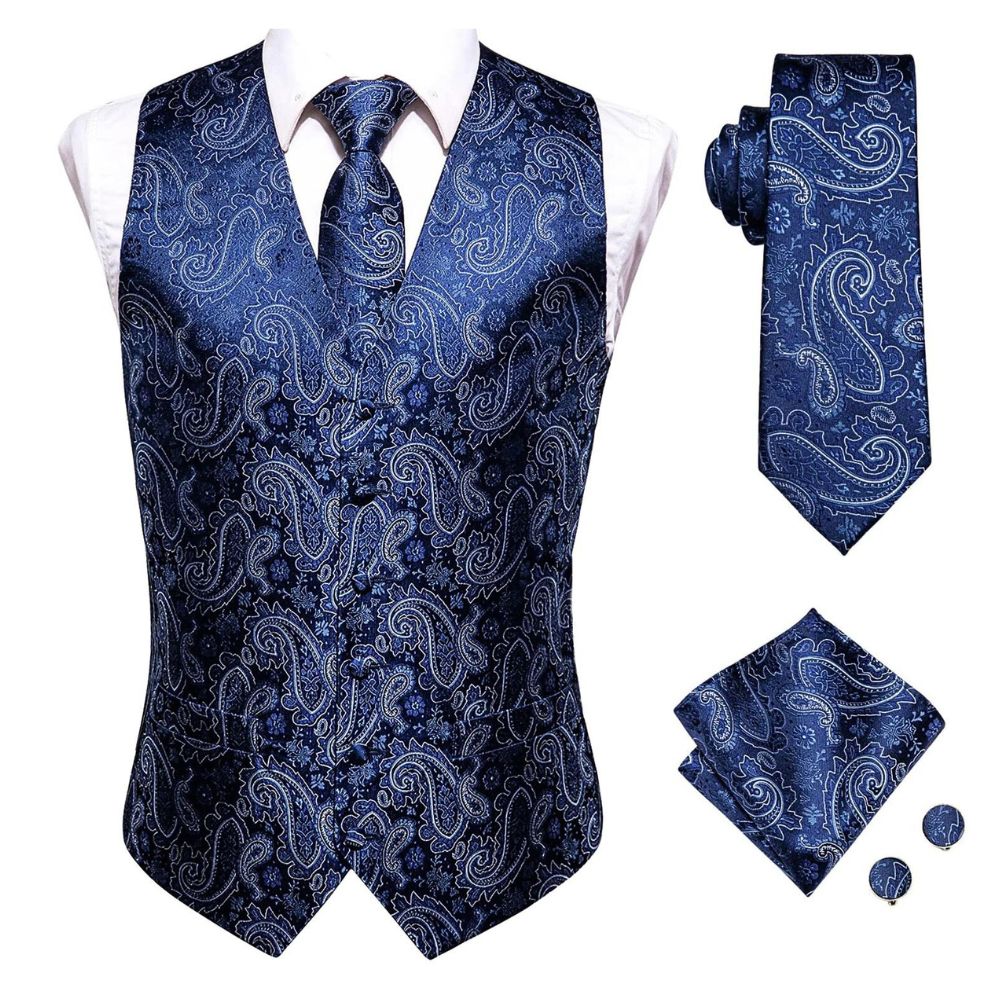 Disponible en trois options de couleur classiques - bleu, noir et blanc - chacune agrémentée de motifs paisley délicats, notre gilet de costume offre une variété de looks pour s'adapter à différents goûts et occasions.