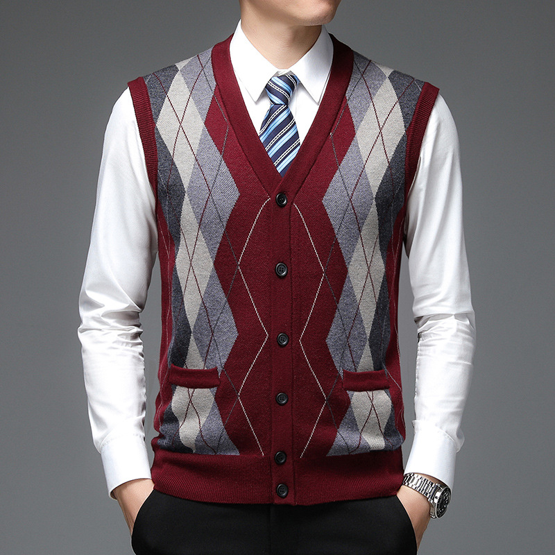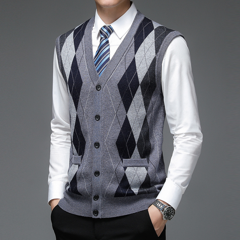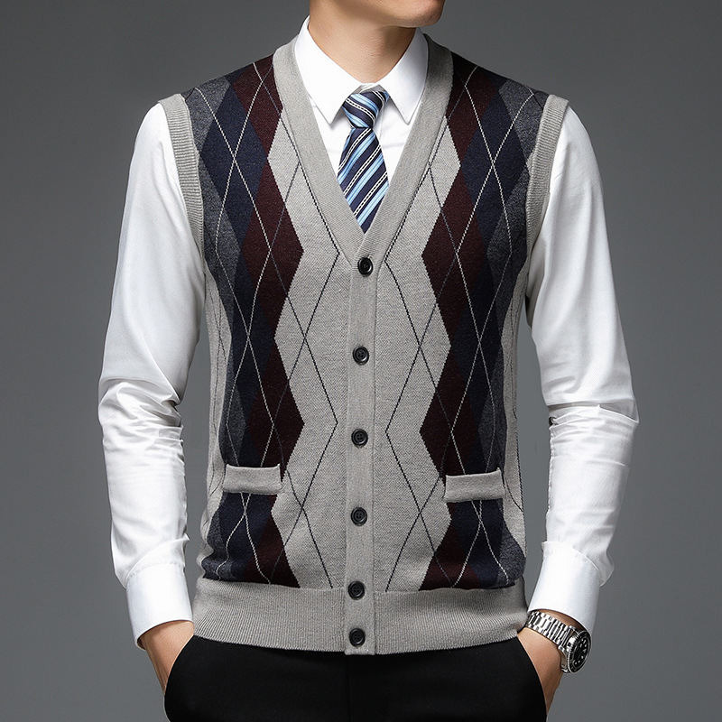 Notre gilet sans manches style cardigan en tricot pour homme se distingue par ses lignes épurées et son col en V, ajoutant une note d'élégance à votre tenue. Polyvalent, il convient aussi bien aux occasions décontractées que formelles. Les subtils motifs à carreaux sur le tricot offrent une sensation de confort unique.